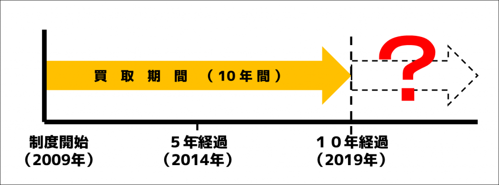 一般家庭の10kw未満の太陽光発電システムで、余った電気を電力会社に高く買い取ってもらえる期間は、法律(FIT法)で設置から10年間と決められています。2009年にこの法律が施行され、10年後の2019年にこの買取り期間が終了する太陽光発電設置者が日本で50万世帯以上にも上るとも言われ、ニュースや新聞で取り上げられる事が増えてきました。